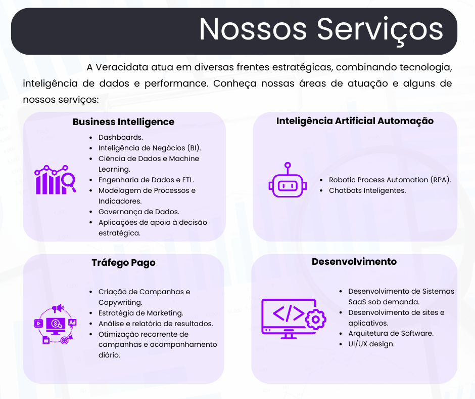 Nosso compromisso é impulsionar o crescimento das empresas com inteligência. Aqui na Veracidata, estruturamos dados, otimizamos processos e criamos métodos para que a tomada de decisão seja estratégica e baseada em informações confiáveis.